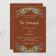 Un fondo de terracota de moda decorado con flores de lavanda y vegetación eucaliptica. Personalice y sus nombres y detalles.