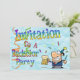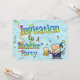 Papel azul claro arrugado como fondo con arte de letras en colores de arcoíris decorado con serpentinas de papel naranja y verde que invitan a la pandilla a una despedida de soltero. Para rematar, hay un tipo de dibujos animados cómicos que lleva un sombrero de fiesta y sostiene un tarro lleno de cerveza, con más serpentinas volando alrededor de él. Un diseño divertido para una ocasión feliz.