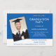 Sencilla Foto De Texto Azul Graduación Blanco 2025. Un diseño moderno totalmente personalizable, con letras blancas en un fondo azul con un borde blanco ancho que recorre el borde inferior. Intercambia fácilmente en tu propia foto de orientación vertical, y el texto puede ser fácilmente personalizado también en ambos lados.