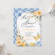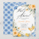 The back of the invitation continues the blue tile and watercolor lemon floral design, creating a cohesive and polished stationery set. Easily personalize with your event details to create a memorable and beautifully styled bridal shower invitation.