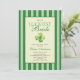 She's the luckiest bride! St. Patrick's day themed bridal shower invitation. The design features elegant vintage inspired calligraphy, adding a touch of classic sophistication to your announcements. This refined script beautifully complements the overall aesthetic, inviting guests with warmth and style. A backdrop of green stripes offers a serene and inviting canvas, creating a harmonious balance between elegance and charm. This pattern evokes a sense of traditional refinement, perfectly aligning with the old money aesthetic. A delicate watercolor illustration of a four-leaf clovers add a whimsical touch to each piece, artfully arranged to bring a sense of joy and fortune to your celebration, making the bride feel like the luckiest bride on St. Patrick's Day.