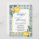 Un elegante diseño Bridal Shower con fondo de azulejos azules y limones.