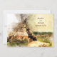 Esta invitación a la boda incluye una hermosa tepea de acuarela tribal ambientada con un paisaje de fondo. En la parte de atrás del texto, hay una flecha de boho con corazones y vides.