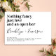 Invite a amigos y familiares a que se unan a usted para las celebraciones de sus bodas con esta divertida invitación a la boda. El texto dice "Nada de fantasía solamente amor y un bar abierto".