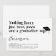 🎉🎓🍕🍺 Invita a amigos y familiares a celebrar una graduación con esta divertida invitación de fiesta con tipografía. El texto dice "Nada lujoso, solo cerveza, pizza y un sombrero de graduación."