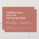 Invite a amigos y familiares a que se unan a usted para las celebraciones de sus bodas con esta divertida invitación a la boda. El texto dice "Nada de fantasía solamente amor y un bar abierto".