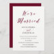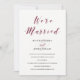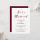 Esta impresionante invitación para la fiesta después de la boda presenta caligrafía de color marsala / borgoña junto con texto negro moderno, sobre un elegante fondo blanco.