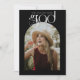 un guión de tipografía moderna limpia y chic con un marco de foto arqueado sobre un fondo de color negro. Personalice fácilmente con sus fotos de graduación y detalles de invitación en la parte delantera y trasera.