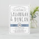 Esta invitación a la boda contemporánea muestra una combinación de tipografía en blanco y negro complementada con un toque de azul polvoriento. El texto principal exuda elegancia con su caprichosa tipografía de estilo dibujada a mano en negro contra un telón de fondo blanco, mientras que la fecha boda destaca en un polvoriento cartel azul. Un borde negro con esquinas redondeadas aporta un toque sofisticado al diseño general de la invitación. En la parte posterior, un diseño geométrico de diseño con cruces blancas de fondo azul añade un elemento moderno y de moda a la suite de invitados.