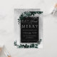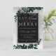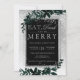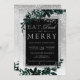 ¡Come, bebe y sé feliz! Una moderna, moda y elegante tipografía plateada Navidades florales de acuarela verde invitan a una fiesta con foliage de color agua verde pintado a mano sobre un gradiente gris de moda con nieve blanca y copos de nieve. Ideal para Navidades o bodas.