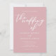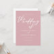 Esta polvorienta invitación a la boda rosa rosa presenta una delicada tipografía blanca para una romántica ceremonia vespertina para una novia femenina a la que le gustan los colores suaves y el mínimo diseño de escritura. El rosa pastel suave invita al descanso.