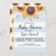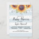 Esta rústica invitación a la ducha de girasol de otoño incluye rayas azules con girasoles florales en la parte delantera y estampados en la parte trasera. Los girasoles son populares este año por una ducha de bebé con temática de otoño.