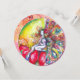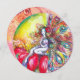 Colorida y caprichosa hada sentada en una flor roja con chispas doradas y colores vibrantes. Pintura acrílica con lámina dorada y plateada con colores iridiscentes.