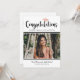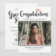 Invitación moderna de fiesta de graduación que incluye “Felicidades” en letra cursiva en negrita, un acento de gorra de color dorado rosa, y una foto a todo lo ancho. Personalice el nombre, la escuela, el año de graduación y los detalles de la fiesta. La parte posterior se coordina con la letra “Fiesta de graduación” más líneas de RSVP, fecha, hora y dirección.