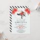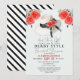 Celebre a la futura novia con esta invitación de despedida de soltera estilo derby chic y moderna que presenta una ilustración de acuarela de un sombrero grande con rosas y un lazo negro en un fondo azul claro. El reverso presenta un patrón de rayas negras y blancas. Personalízala para satisfacer tus necesidades.