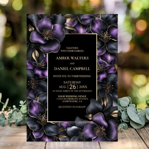 Haz una declaración con nuestra invitación a una boda en blanco y negro con un motivo floral morado y gris. Este diseño marca la pauta para una celebración inolvidable. El texto del personalizable le permite añadir sin esfuerzo los nombres de la novia y del novio, la fecha del boda y los detalles necesarios de su celebración. Diseñado para una pareja de expertos en presupuesto, la ubicación de la recepción, la solicitud de respuesta de RSVP, los detalles del alojamiento y cualquier otra información que sus huéspedes puedan necesitar se pueden incluir en el reverso de esta invitación, ahorrando dinero en papel extra. Hay una variedad de tipos de papel y estilos de esquina disponibles para sus invitaciones únicas, junto con la opción de descargar.