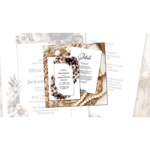 Invite a sus amigos y seres queridos a su boda para que presencie y celebre el comienzo de su viaje de toda la vida con esta rústica invitación floral de otoño. El texto del personalizable le permite añadir sin esfuerzo sus nombres, fecha de boda y los detalles necesarios de su celebración. Diseñado para una pareja de expertos en presupuesto, la ubicación de la recepción, la solicitud de respuesta de RSVP, los detalles del alojamiento y cualquier otra información que sus huéspedes puedan necesitar se pueden incluir en el reverso de esta invitación, ahorrando dinero en papel extra. Hay una variedad de tipos de papel y estilos de esquina disponibles para sus invitaciones únicas, junto con la opción de descargar.