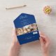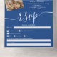 Moda azul blanco elegante y elegante llamada clásica en una invitación de boda caligrafía con rsvp, alojamiento, detalles y más información. Con un guión moderno y de moda, añade 4 de tus fotos.
