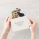 Elegante color crema clara o invitación boda privada e invitación a la boda con una tarjeta postal RSVP desgarradora que proporciona una cómoda respuesta sin sobres de sus invitados. Este diseño presenta su foto en el flap interior superior, "Feliz eterno después del Fiesta" en una mezcla de tipografía simple y un guión moderno y sus nombres en un guión característico. La tarjeta RSVP sobrepone una segunda foto.
