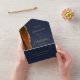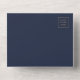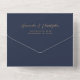 El borde izquierdo de esta elegante y moderna invitación a la boda todo en uno y RSVP cuenta con una acuarela naranja quemada bordeada con un falso purpurina de oro. El texto del personalizable combina un guión de caligrafía elegante de color dorado y fuentes sans serif en un fondo azul marino. La dirección de retorno aparece en la solapa exterior y en el reverso de la tarjeta RSVP desmontable en texto de color dorado sobre azul marino sólido.