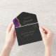 El borde izquierdo de esta elegante y moderna invitación a la boda todo en uno y RSVP cuenta con un borde de batido color morado con falso purpurina de oro. El texto del personalizable combina un guión de caligrafía elegante de color dorado y fuentes sans serif sobre un fondo negro de pizarra. La dirección de retorno aparece en la solapa exterior y en el reverso de la tarjeta RSVP desmontable en texto de color dorado sobre pizarra sólida negra.
