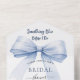 Un fondo blanco, decorado con un gran arco azul. Personalice y agregue el nombre, los detalles del fiesta, la fecha RSVP, la dirección de devolución y el nombre. Texto: Algo azul antes que yo.