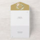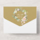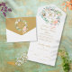 Invitación de aniversario de bodas de oro 50 todo en uno que incluye una guirnalda floral con los detalles del evento en tipografía elegante. La invitación incluye una tarjeta de RSVP perforada que se puede dirigir individualmente o dejar en blanco para escribir la dirección del invitado y las iniciales del monograma dentro de una guirnalda floral en un fondo dorado. Diseñada por Thisisnotme©