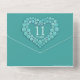 Evento de cumpleaños de aniversario de bodas de turquesa número 11 con invitaciones RSVP desmontables. Hermoso efecto de cuentas de turquesa en forma de corazón impreso en gráficos de invitaciones de aniversario de bodas número once, personalice con los detalles de su fiesta de aniversario de bodas, una foto de la feliz pareja, haga que los invitados utilicen el rsvp fijando un sello o devolviendo el formulario lleno a través de su correo electrónico, ideal para facilitar las respuestas. El aniversario número 11 está asociado con la piedra preciosa turquesa y el corazón simboliza el amor. Gráficos y diseño de Sarah Trett para www.mylittleeden.com