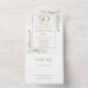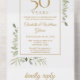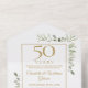 Invitación de aniversario de bodas dorado número 50 que incluye todo, con follaje de vegetación en estilo acuarela y los detalles de su evento en tipografía dorada elegante. La invitación incluye una tarjeta de RSVP perforada que se puede dirigir individualmente o dejar en blanco para que usted escriba a mano los detalles de la dirección de su invitado y las iniciales del monograma chic en un fondo dorado. Diseñado por Thisisnotme©