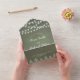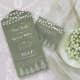 Árboles y luces de cuerdas en verde ceniza encalada todo en una invitación a la boda. Cuenta con árboles blancos y luces de cuerda en color verde. Los nombres están en la tipografía del guión y se puede desprender la tarjeta RSVP.