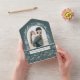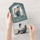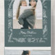 Este diseño único presenta una plantilla de foto con forma de arco de moda con un borde botánico invernal dibujado con línea blanca sobre un fondo verde salvia. Los paneles presentan gráficos florales complementarios, campos de texto y una plantilla de foto desgarrable adicional.
