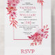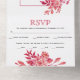 Esta invitación de bodas de verano completa un arco adornado con un hermoso arreglo de flores y hojas rojas y rosas. El diseño de la invitación incluye un marco con rosas, dahlias y follaje en tonos rojos. Además, la invitación incluye una tarjeta de respuesta RSVP desmontable para mayor comodidad.