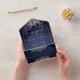 Invitación de boda gótica todo en uno con rosas negras y doradas que caen a través de un arco dorado que encierra tipografía elegante sobre un fondo azul de medianoche. La invitación incluye una tarjeta de RSVP perforada que incluye el código QR del sitio web de su boda y detalles. Diseñado por Thisisnotme©