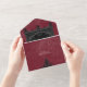 DISPONIBLE CON O SIN CÓDIGO QR O CON O SIN OPCIONES DE SELECCIÓN DE CENAS. Traslade a sus huéspedes a un mundo de oscuridad y encantadora elegancia con nuestra vintage invitación a bodas góticas. El fondo profundo y envejecido del vino de color burdeos prepara el terreno para un sorprendente contraste, a medida que el texto en negrita blanco emerge de intrincadas cajas negras de texto. En el pináculo de esta invitación, un borde gótico tridimensional adornado con un arco negro real captura la esencia del misterio y el romance. La carta de respuesta, adornada con dos viñas entrelazadas de rosas negros formando sutilmente un corazón, agrega un toque de encanto dramático. Como flor final, el exterior exhibe un arco gótico tridimensional y un medallón decorativo, asegurando que sus invitaciones a la boda sean una gran primera impresión. Desate la magia y marca el tono para un día de boda inolvidable. Creado por Simply Farmhouse Press.