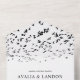 Esta magnífica invitación a la boda se caracteriza por innumerables pájaros reunidos en negro puro sobre un fondo blanco. El título Aves de una pluma significa la importancia de que la vida de la pareja se una al matrimonio. Elegante, elegante, moderno y único. Por favor, háganme saber (Tracey) si tiene alguna solicitud de edición de diseño en orabellaprints@outlook.com.