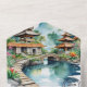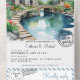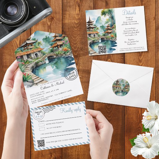 This beautifully illustrated design captures the peaceful charm of a bali indonesia destination wedding through a serene watercolor landscape featuring elegant pagoda-style temples, a curved garden bridge, and a tranquil reflecting pond surrounded by lush tropical blooms. The artistic scene evokes the feeling of an asian garden scenic paradise wedding, transporting guests to an idyllic island resort where romance and nature blend seamlessly.