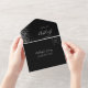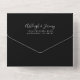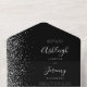 The left-hand edge of this elegant modern all-in-one wedding invitation and RSVP features a silver faux glitter border. The customizable text combines silver gray whimsical handwriting, copperplate and italic fonts on a black background. The return address appears on the outside flap and the reverse side of the detachable RSVP card in silver gray text on solid black. A QR code is included on the RSVP card for guests who would prefer to reply online.