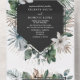 Diseño botánico tropical con flores blancas y diseños geométricos gris oscuro con texto blanco. RSVP desprendible con código QR.