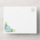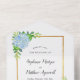 Estas invitaciones a la boda presentan un diseño floral moderno con flores de horangea azul, hojas, follaje y un borde de oro falso. Personalízalos con tu propio texto.