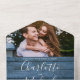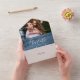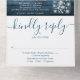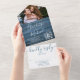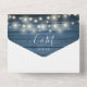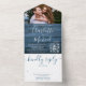 Todo en una invitación a la boda fotográfica con luces de cuerdas de bonito, jarras de albañil, nombres de estilo y tipografía de moda sobre un fondo azul rústico de madera. La invitación incluye una tarjeta RSVP perforada que puede ser dirigida individualmente o dejada en blanco para que pueda escribir a mano los detalles de la dirección de su invitado. Diseñado por Thisisnotme©