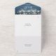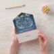 Todo en una invitación de boda con luces de cuerda de bonito, guirnaldas florales hechas a mano y tipografía de moda en un fondo azul rústico de paneles de madera. La invitación incluye una tarjeta RSVP perforada con el código QR de su sitio web boda y detalles. Diseñado por Thisisnotme©
