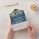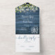 Todo en una invitación matrimonial con vegetación, luces de cuerda de bonito, jarras de albañil, nombres de estilo y tipografía de moda sobre un fondo azul rústico de madera. La invitación incluye una tarjeta RSVP perforada que puede ser dirigida individualmente o dejada en blanco para que usted escriba a mano los detalles de la dirección de su invitado. Diseñado por Thisisnotme©