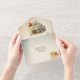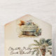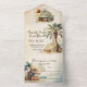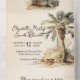 Todo en una sola invitación a la boda de la playa. Palmeras acuáticas, cabaña en la playa, cartel con pájaros y flores.
