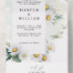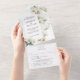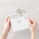 Acepte el encanto de un prado besado por el sol con esta invitación triplicada a la boda. El texto es desenfocado, adornado con encantadoras daisies en un patrón orgánico. Adjunta, una conveniente tarjeta postal RSVP con opciones de comida que completa esta invitación de bodas de verano.