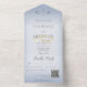 DISPONIBLE CON O SIN CÓDIGO QR PARA ESCALAR. Este diseño sencillo y elegante tiene un aspecto moderno, con dos anillos de boda dorados entrelazados sobre un suave fondo azul polvoriento y blanco. Las invitaciones todo en uno personalizadas son una combinación única de una invitación personalizado bien impresa y una postal RSVP fácil de desgarrar. ¡Y son tan fáciles de usar! Simplemente se pliega, después sella la solapa de atrás con los tres pegatinas claros incluidos y el correo. Y cuando sus invitados reciben la invitación de su personalizado, ¡simplemente sacan la tarjeta RSVP perforada y la envían de vuelta al correo!