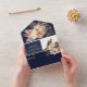 Celebra tu día especial con esta rústica invitación a la boda todo en uno de color azul marino. Con flores de acuarela exuberantes, acentos de melocotón cálidos y una elegante vegetación, esta invitación ecológica es perfecta para los bodas en otoño o en el jardín. El cómodo formato todo en uno significa que no se necesita ningún sobre, simplemente doblar, sellar y enviar. Personalizar con sus fotos, texto y detalles de RSVP para una hermosa y sostenible celebración.