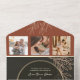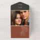 Moderna, bohemia, minimalista invitación de boda todo en uno de color naranja quemado terracota negro y blanco con cuatro fotos personalizadas de la pareja.