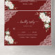 TODO EN UNA invitación. Al incluir los detalles y el RSVP en la invitación a la boda en lugar de en una carta separada, es una buena elección. Diseño encantador con una delicada magnolia blanca de acuarela, flores rosas, esquinas de encaje, sobre fondo burdeos real. Para ver los artículos que coincidan, por favor, visite mi Colección Floral de Magnolia Blanca.