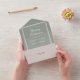 Invitación de boda todo en uno con tipografía elegante y monograma inicial en fondo verde salvia. La invitación incluye una tarjeta de RSVP perforada que puede ser dirigida individualmente o dejada en blanco para que escriba a mano los detalles de la dirección de su invitado. Diseñado por Thisisnotme
