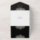 Invitación de boda gótica todo en uno con rosas negras y doradas, flores que caen sobre tipografía elegante. La invitación incluye una tarjeta RSVP perforada con el código QR del sitio web de su boda y detalles. Diseñado por Thisisnotme©